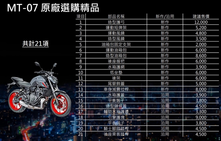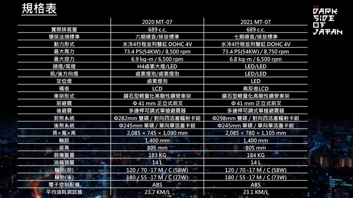想知道新款 MT-07 的詳細規格,YAMAHA 將舊款與最新年式的 MT-07 規格詳細列出,有興趣的網友可以比較看看哦!