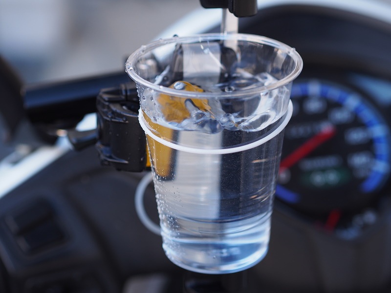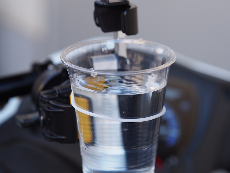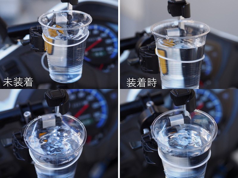 首先在沒有安裝減震模組的情況下開始驗證!發動引擎並轉動油門後,水杯內的水馬上如跳舞般的潑灑而出!讓筆者有點擔心安裝後會有什麼改變…