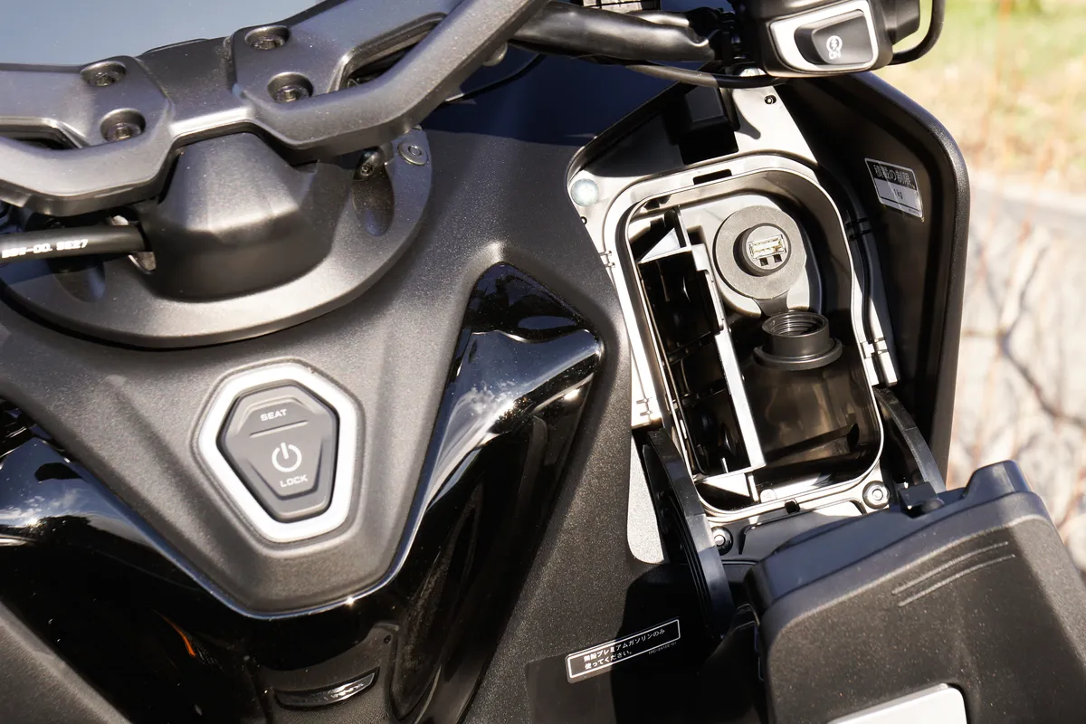 - 便利的手機收納空間內附 USB Type-A 插槽。中央開關支援電源啟閉、龍頭鎖、座墊開啟。