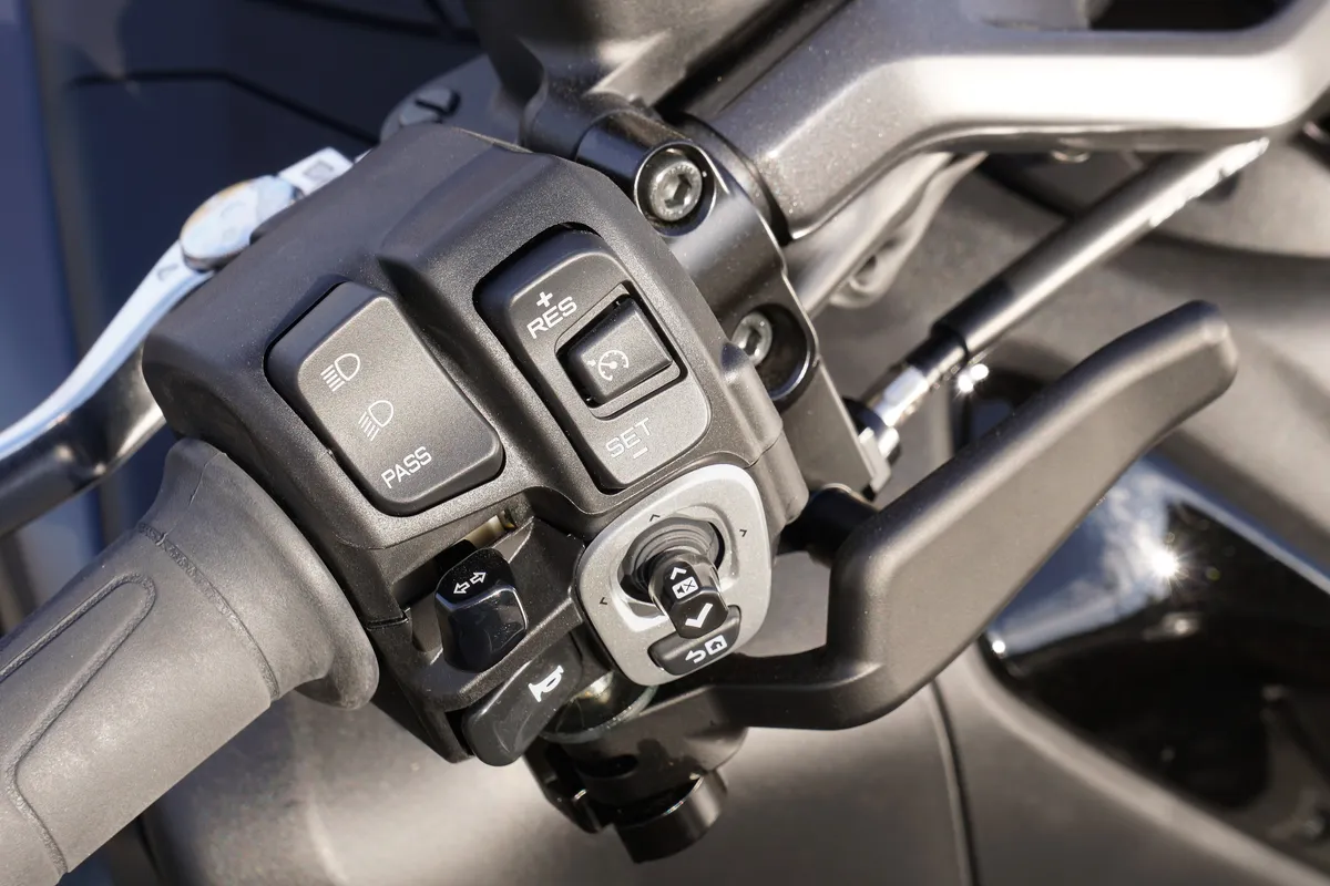 - 定速巡航設定短按為增減1km/h,長按為每10km/h增減。搖桿即便戴手套操作感也良好。下方撥桿為手煞車。