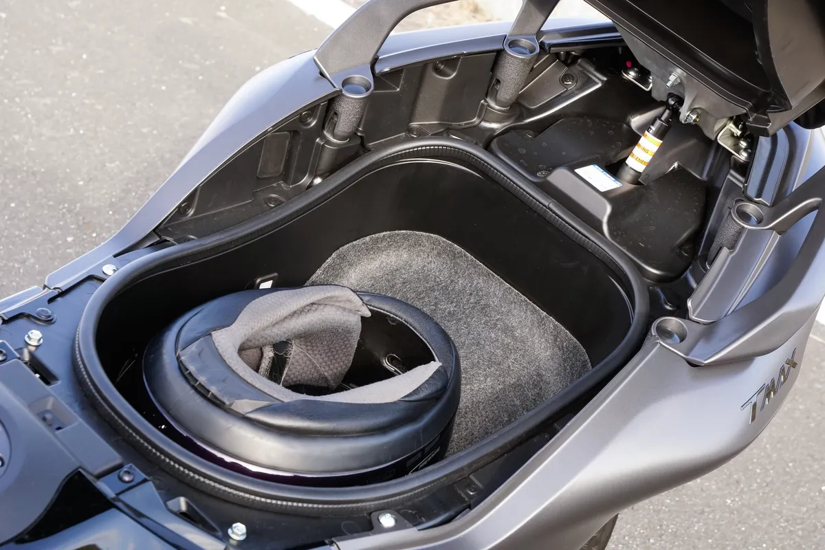- 座墊下空間容量約30公升,可收納一頂全罩安全帽。以車格而言容量稍顯不足。座墊配有油壓桿,開閉順暢。