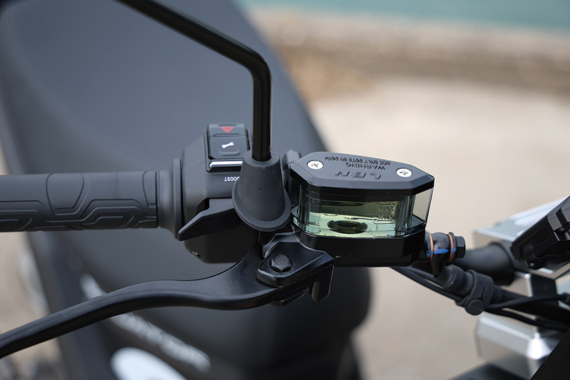 制動系統方面(迫力),手感回饋不錯。前單向兩活塞、後對向雙活塞的卡鉗配置,用來煞停這輛輕盈的車身的電羊絕對游刃有餘,制動力非常充足。唯一美中不足的是ABS防鎖死系統的介入時機稍嫌突兀,如果廠方日後能針對介入時間作微調,令操控感會更加細膩。