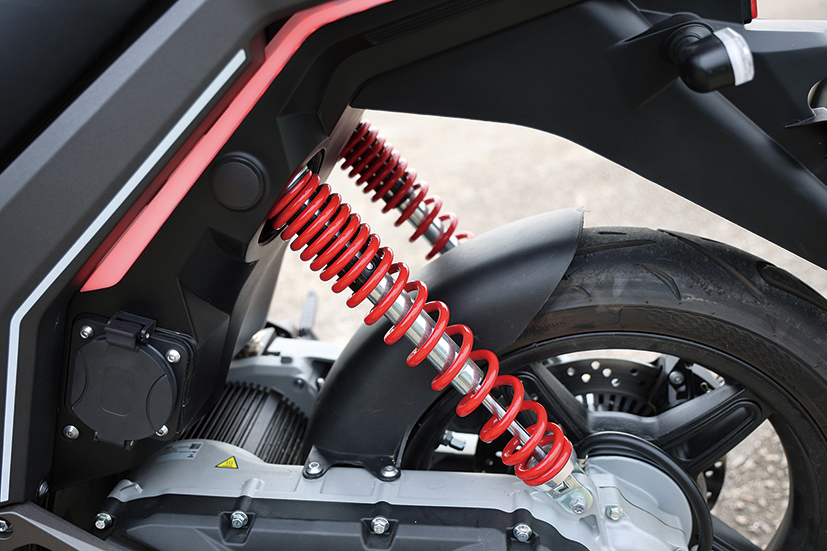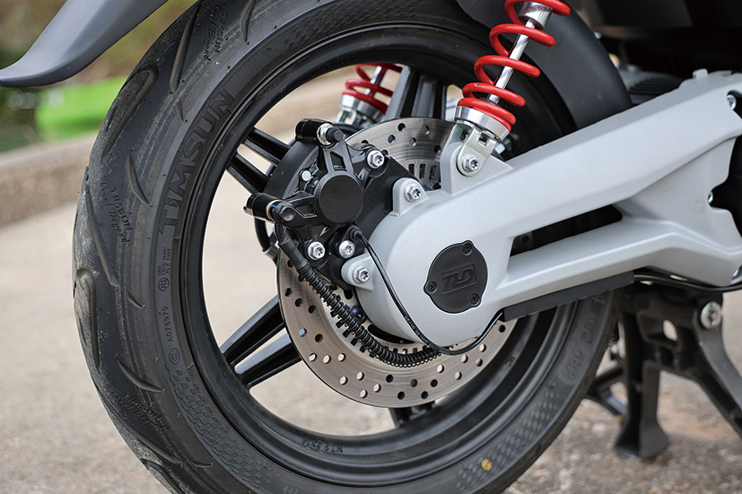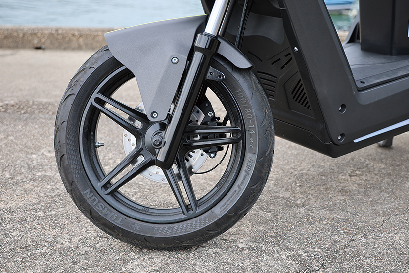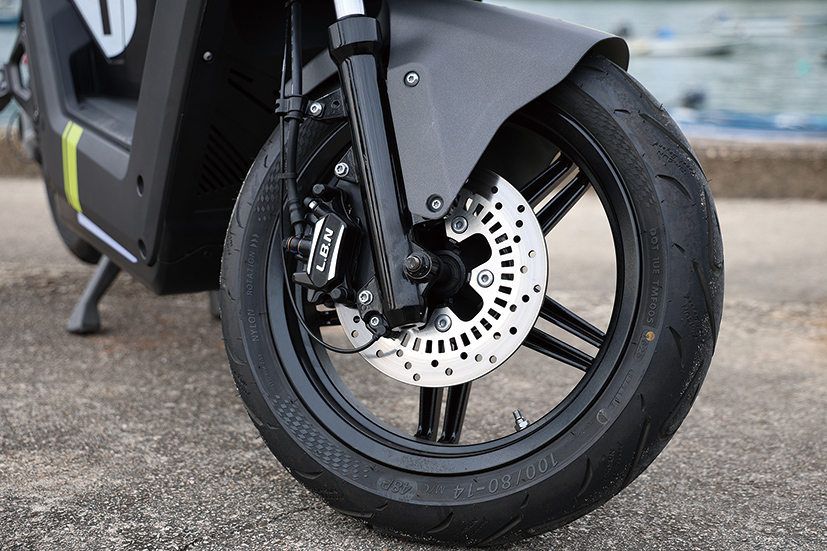 制動方面,STD版配置了CBS前後聯動碟煞,而高配的Plus版則配置ABS煞車系統。避震方面,前方是正立前避震,後方為傳統的雙避震設計。前/後均採用14英吋鋁合金星形輪框。估計為了節能省電,前/後輪胎配置尺寸100/80-14,這後輪胎寬度相比125c.c.級別汽油綿羊是屬於比較窄。整套制動和避震配置,算不上高級別,但可在城市通勤中的各種路況迎刃有餘。