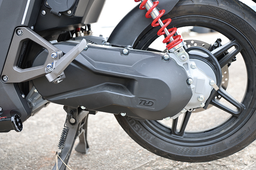 固定在後搖臂的風冷永磁電機峰值扭力為36.11kg-m,鋰電池5.8kWh(磷酸鐵鋰)容量為70.4V-72Ah,極速可達110km/h。電池組重23kg,採用快速充電可在60分鐘內從電量30%增加到80%。如果在45km/h時速行駛,續航里程可達150公里。配合一體式鋁合金車架的空間結構,電池安置在腳踏下的低重心區域,騰出座墊下的20L儲物空間,可放置一個全面頭盔及手套。如此分佈讓整車提升行駛時的操控性。