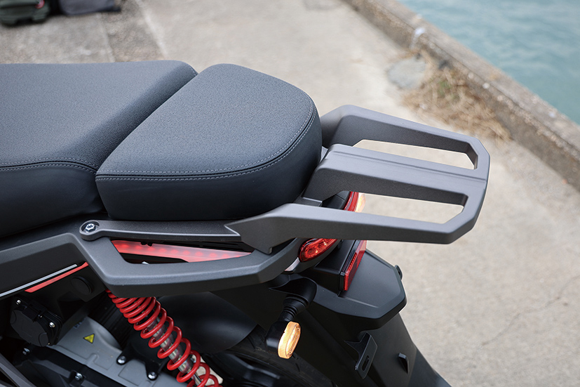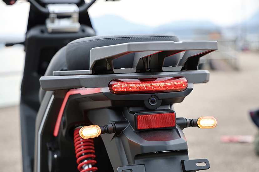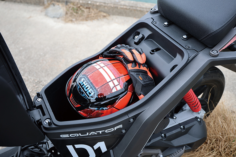 由於電池設在地台之下,而座墊是採用分離式設計,騎仕座位的下方設有一個容量不俗的儲物空間,足夠收藏筆者的全面頭盃(連藍牙)及手套,由於沒有貫連到乘客座位空間,所以如果新車主想加置尾箱,就可以設置到較前的位置,令重量可以分佈得更好。相信這是廠方顧及一些需要送貨或速遞員而設計,而且原裝已附設了一個小尾板,足以裝置較大容量的尾箱。