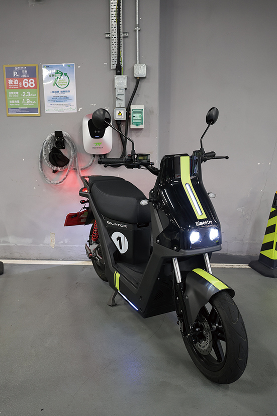 而新車的另一亮點是不可拆卸電池充電,電池就設在平地台之下,廠方就採用了車用充電設計,好處是可以在坊間的停車場付款充電,不過現時已有一些地舖變成了充電站,聽聞有些充電站更設有可為這款新電動電單車充電設施。代理表示這些在電車界叫做「中充」,並不是「快充」,後者是專為電動汽車而設的,而這新車只適用於前者,當日試完車後筆者與代理駕車到觀塘某個充電站查看充電詳情。