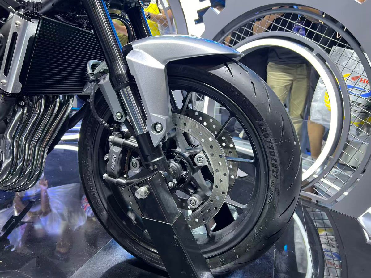 車體架構如預期,以引擎作為剛性成員的鋼管鑽石型車架為核心,配備前倒立式前叉、後鋁合金搖臂搭配多連桿單槍避震,形成了近年來的標準配置。雖然雙搖籃車架(Double Cradle Frame)以舒適悠閒的騎乘感為特色,也是舊款 CB400SF 那種無與倫比的易操性與紮實接地感的源頭,但相信憑藉現今最新的設計技術,新型號依然能重現那種「很有 CB 味」的騎乘體驗。