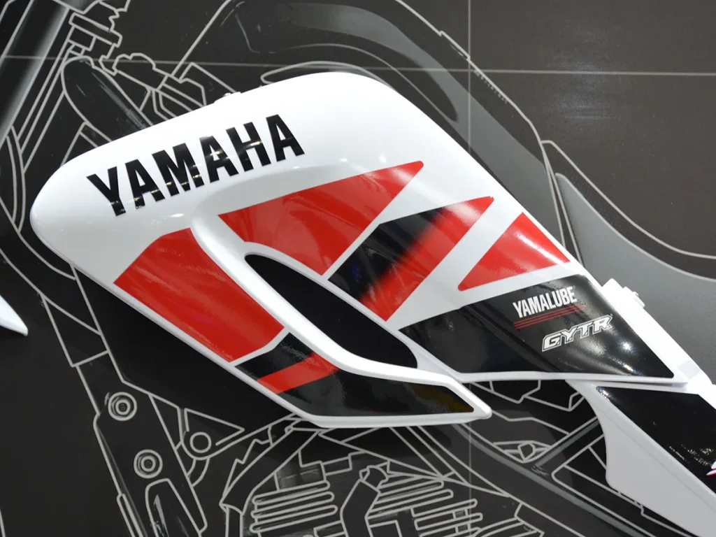 水箱側蓋採用紅色和黑色經典速度鏈塊(Strobe line)線條設計,並印有 YAMAHA 和 YAMALUBE 等標誌。
