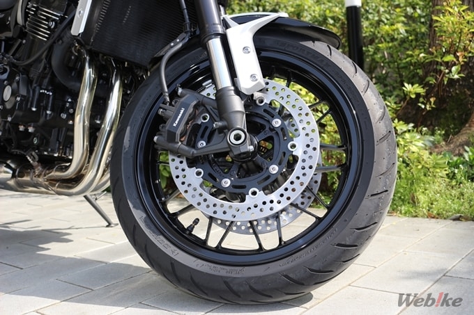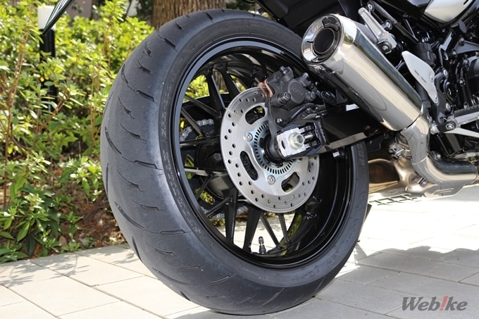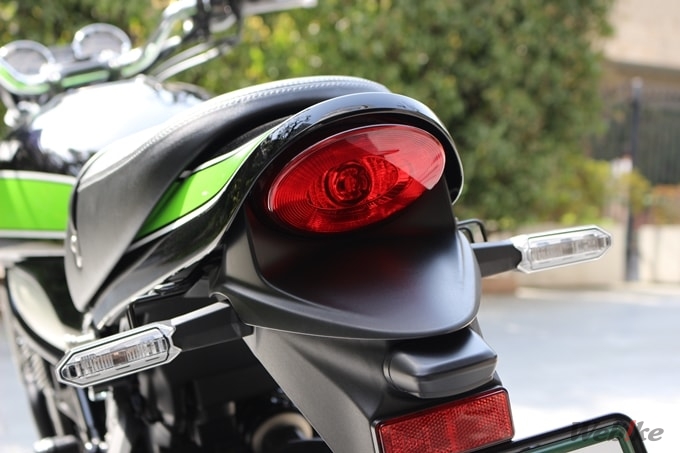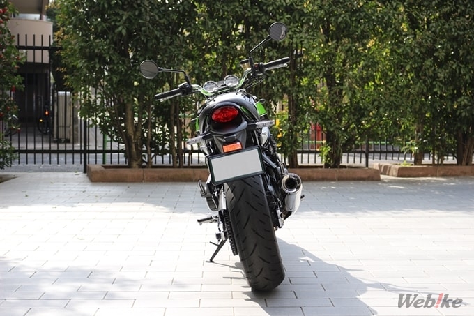 在轮胎方面,Z900RS在前后都采用17吋轮胎,所以能有安定的骑乘感,后轮宽度则有180mm,使车尾看起来魄力十足。