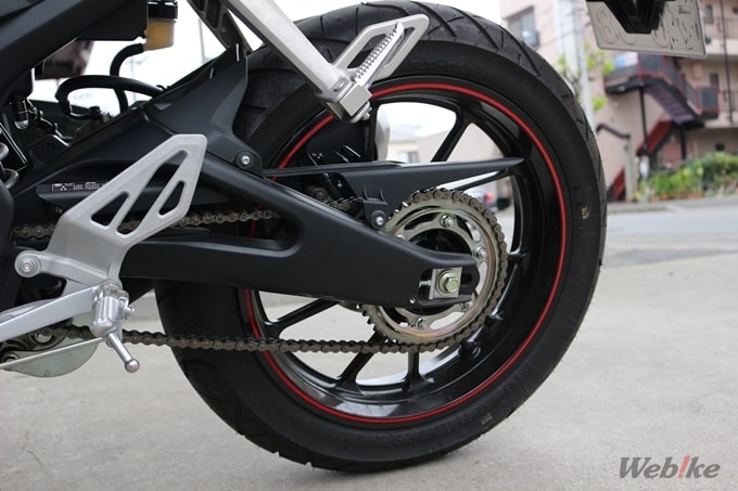 轮胎尺寸前后分别为前轮:100/80-17、后轮:140/70-17,提供在骑乘时能够最大限度的有效利用车辆轻盈感。