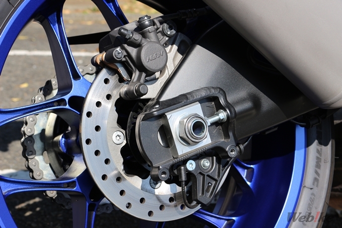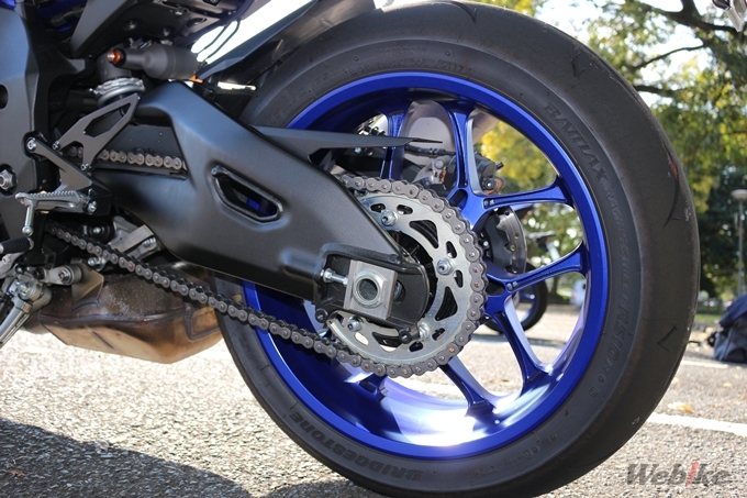 虽然因为造车成本的关系,一般市售车几乎没有搭载镁合金轮框的车款,但是强调彻底轻量化的YZF-R1,就连轮框也没有例外地成为需要减轻重量的零件之一。