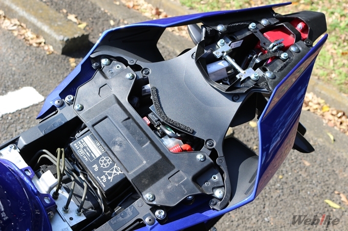 YZF-R1的坐垫形状强调运动骑乘并提高骑乘姿势的自由度,造就出能够轻松改变重心的同时,依旧可以保持安定的骑乘姿势。至于坐垫下方的收纳空间也很有超级运动车款的风格,精美的空间小到连放皮夹或驾照都不容易(笑)。