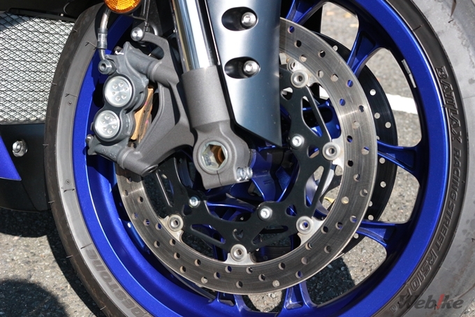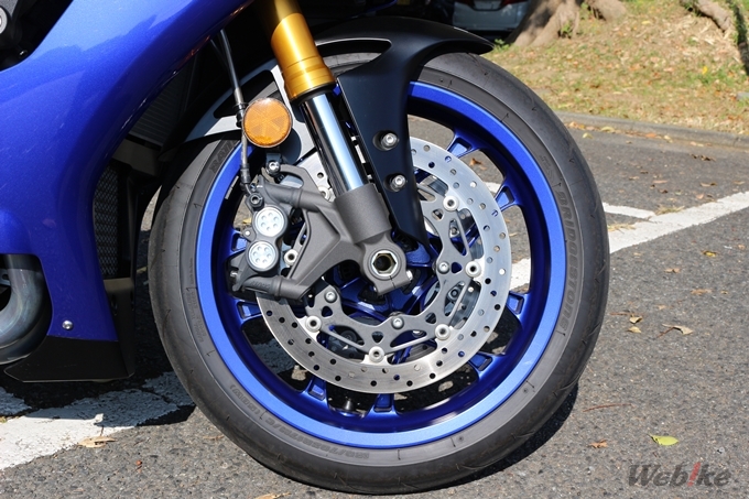 YZF-R1采用镁合金轮框,因此和前一代相比的后轮减轻了340g、前轮更是削去了530g的重量,也让惯性矩分别减轻4%及11%,搭配的轮胎尺寸则分别是前轮120/70ZR17M/C(58W)、后轮190/55ZR17M/C(75W)。