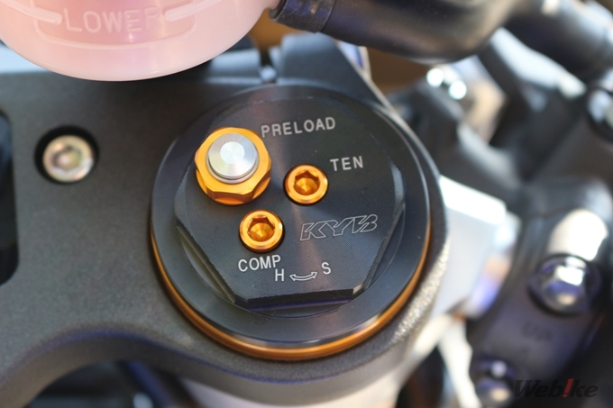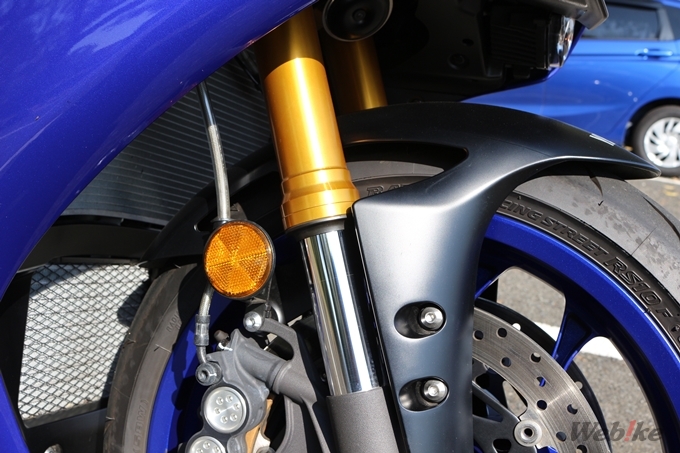 现行款YZF-R1的前叉采用由KYB制、直径43㎜的倒立式前叉,可以从顶盖调整预载及阻尼。后轮悬吊装置则同样采用KYB制的中置单枪多连杆挂瓶后避震,除了阻尼可调外还将车高调整装置列为标准配备。