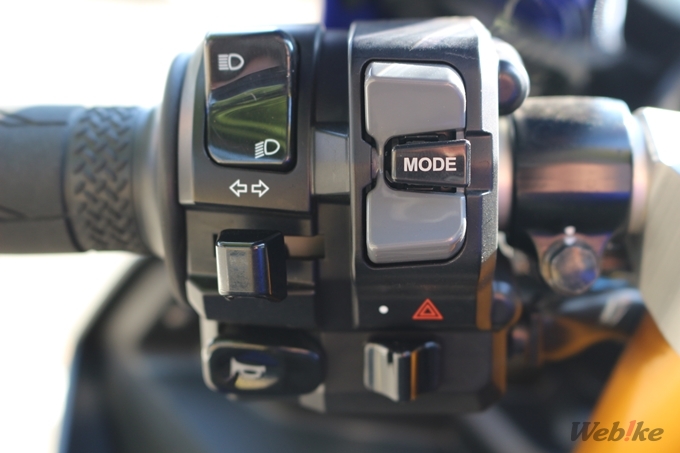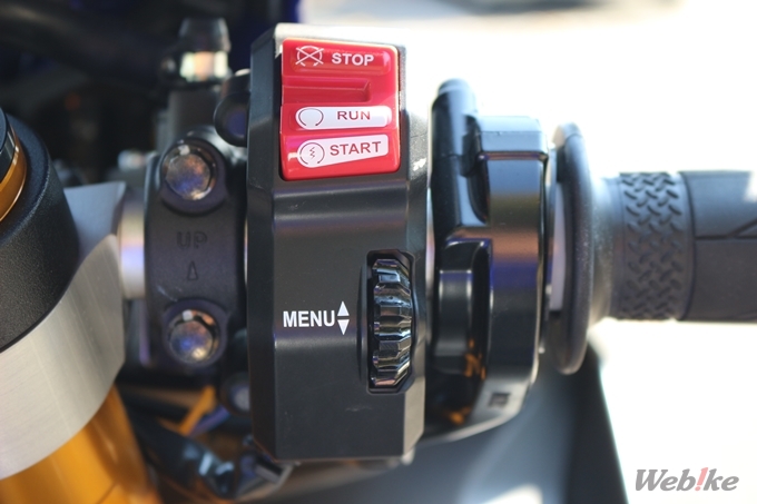 仪表板的显示切换、电子控制系统的设定等,全部都可以使用握把旁边的开关操作。长按右边把手开关上的“MENU”键就可以切换设定画面,除了在设定画面可以更改电子控制系统的各种介入设定及表示资讯之外,在一般画面时也可以使用握把左侧的灰色按钮来调整各种电子控制系统的介入程度。