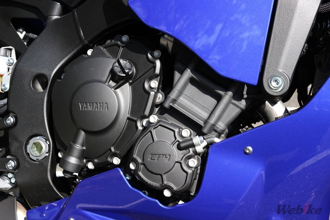 YZF-R1的最大特色可以说是配备了十字曲轴的并列4汽缸引擎“CP4”,虽然YZF-R1一直以来都搭载十字曲轴引擎,但是新款引擎的缸径比历代YZF-R1稍微增加1mm,并且将行程改短,因此成功提高了压缩比。引擎转速更是提高了1000rpm,让最大马力也提高到200ps大关。
