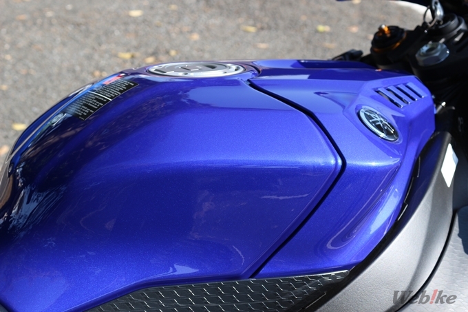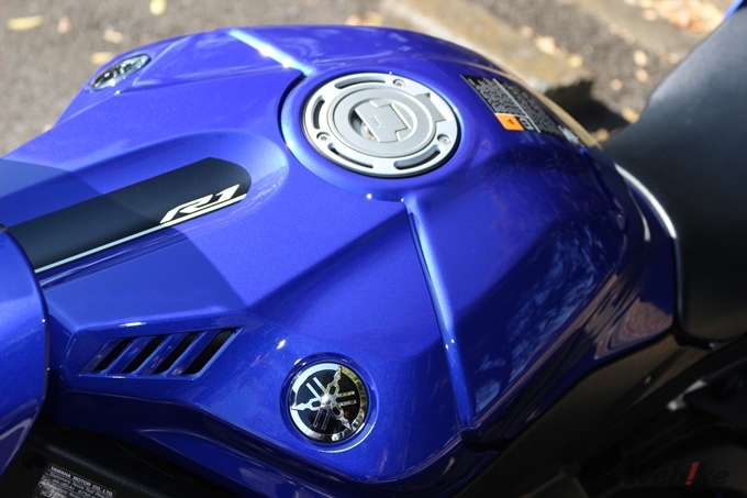 虽然YZF-R1的油箱容量有17L,但为了减轻重量也改为铝合金制,且还改良了油箱的外型设计,借此提高膝盖与大腿内侧紧贴油箱还有转弯内倾斜挂时的服贴性,同时也增加骑乘姿势的自由度。