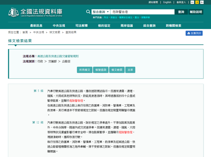 根据全国法规数据库的条文来看,有关于危险警告灯的相关规则,仅在高速公路及快速公路交通管制规则有相关使用时机,分别在第 5 条、第 12 条、第 15 条、第 16 条以及第 17 条有提到。