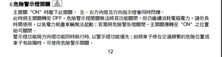 除此上述公部门的资料外,参考了配备危险警告灯车款的原厂手册,大多会看到下列文字 : “警示灯功能与方向灯功能同时执行时,以警示灯功能优先;如将车子停在交通频繁的危险位置或车子有故障时,可使用危险警示开关。”这边是要提醒车主危险警告灯会盖过方向灯,因此如上述所说,变换车道还是得先关闭危险警告灯。