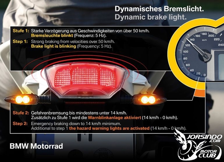 插一下相关规范,在车辆灯光与标志检验规定中,对于紧急煞车讯号有详细的说明,且在机車灯光与标志检验规定(三)煞車灯中提到:机車煞車作用时,煞車灯应为续亮,不得闪烁。但配备符合車辆安全检测基准“紧急煞車讯号”功能者,不在此限。照这样规范看来,BMW 这套系统在国内也是可行的!