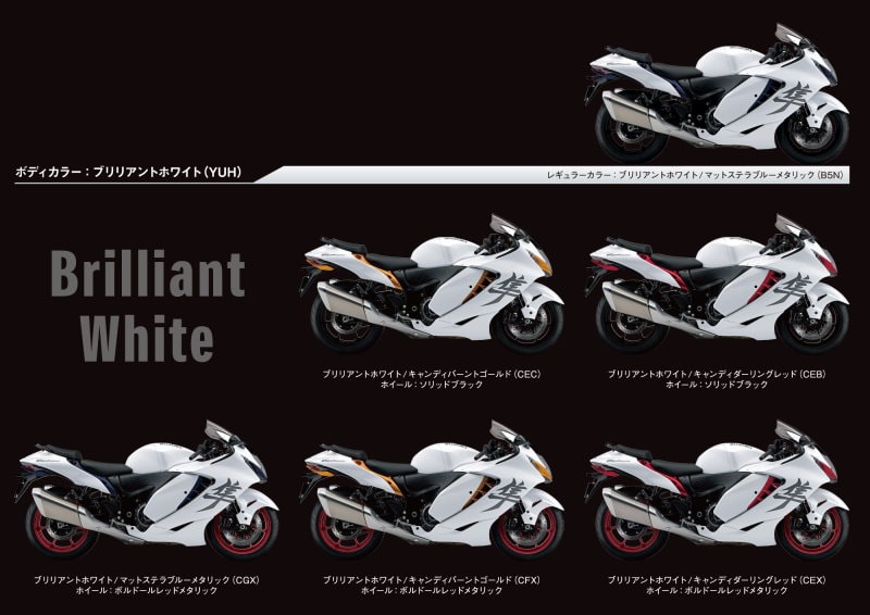 值得注意的是除了标准涂装配色以外,SUZUKI这次还推出了能够选择外装颜色以及轮框颜色的“自选色系方案”,不同颜色的搭配总共可以组合出多达18种款式,绝对能够让你入手一台符合自己心意的特别HAYABUSA。