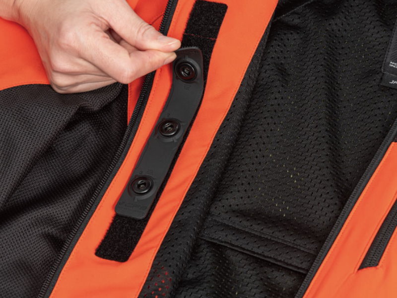 考虑到骑乘时风的流动路径,将网格布料设计在胸部及侧面,即使是夏天也能提供舒适的透气机能,且考虑到安全性,双肩及手肘皆配备有通过CE LEVEL.1的护具,前胸与后背也可以透过选购加装护具以提升防护性能。