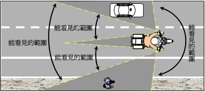 机车骑士虽然没有汽车的的眉眉角角,但安全帽款式也是影响视野的主因之一。加上机车体积较小,又不像汽车除了左右后视镜外还有中央后视镜可以弥补后方视野的不足。机车骑士果然是高风险的弱势族群啊。