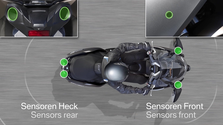 但汽车有盲点侦测,而风险更高的机车呢?工程师们努力地在机车上研究如何安装类似的机构,终于在 2015 年的米兰车展,BMW 在 C650 GT 上搭载一套名为 SVA (Side View Assist) 的盲点侦测系统,也是近代首度搭载盲点侦测的市售机车。这套系统是透过位于车前与车尾的雷达传感器来感应盲区的动态。