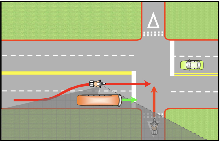 而未来的规划是这样,在都会区的每个路口设置感应器与发射器,届时每辆车上皆有能与大数据连结的车联网系统,将车身车上搭载的行车辅助等系统收集的数据透过 5G 讯号将车辆与路况传递至大数据中心,再透过运算以即时的方式提供给每位用路人。以下图为例,机车骑士为了要闪避右转的大型车,所以左切至内车道,他右侧的视线已被大型车辆遮蔽,所以看不到一辆由右侧朝他直行的车辆,在无法得知前方路口的状况下,极有可能会造成事故。