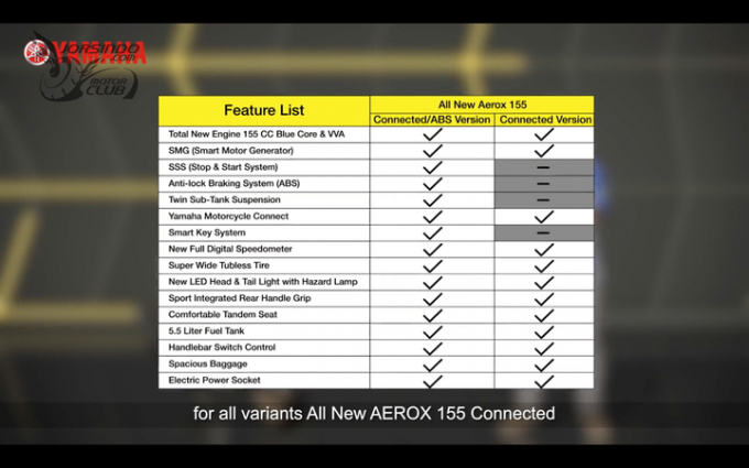 本次推出 Aerox 155 Connected ABS 以及 Aerox 155 Connected 兩種版本,透過圖表可比較兩者間配備的差異。