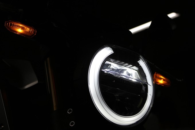 採用CB-R家族相同「NEO SPORTS CAFÉ」概念的圓形LED頭燈組,啟動車輛時光圈定位燈會亮起,上半圈是近光燈、開啟遠光燈實則上下皆會亮起。