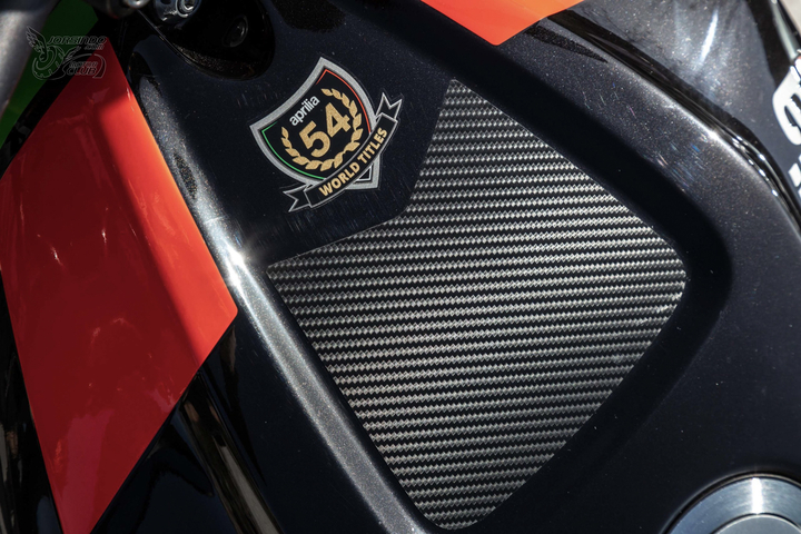 油箱上的勝利紀念貼紙也代表 Aprilia 在漫長賽車史中奮鬥的證明,54 次的冠軍紀錄彰顯不俗的造車工藝。