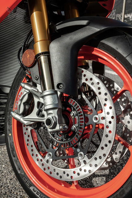 前制動則是採用 Brembo M50 對向四活塞卡鉗,碟徑為 Ø330mm,後制動則是 Brembo 單向雙活塞卡鉗,搭配 Ø220mm 浮動碟。