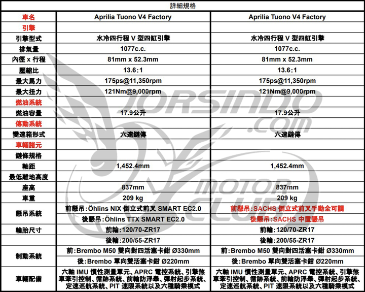 6. 共有 Tuono V4 以及 Tuono V4 Factory 兩種版本