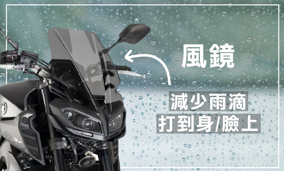 風鏡平常除了控制行進風阻和風流導向以外,如果換上較長的風鏡,在下雨時可以大大減少雨滴打到臉上、身體的痛感!
