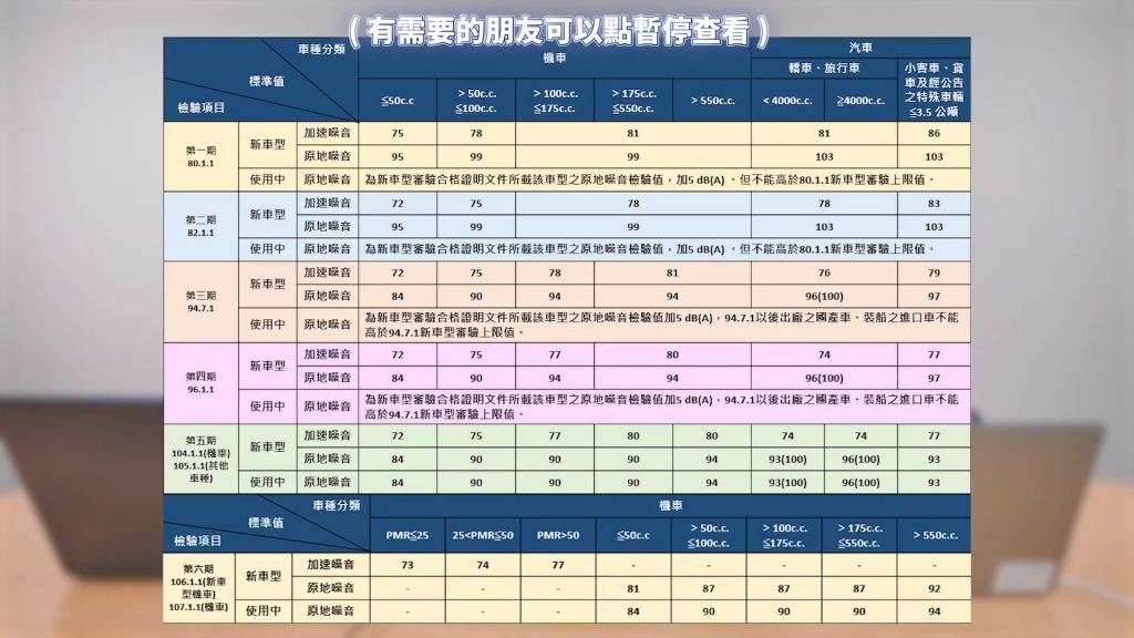 根據規定,五期及六期車款的原廠排氣管音量,白牌與黃牌車款不得超過90分貝,紅牌車款則不得超過94分貝。至於第四期以前的車款,需參考原廠檢驗報告,並額外加上5分貝的限制。