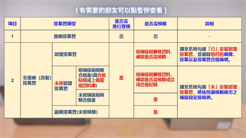 此外,目前僅有原廠排氣管不需要進行登錄與檢驗,其他改裝或副廠排氣管都必須進行檢驗,