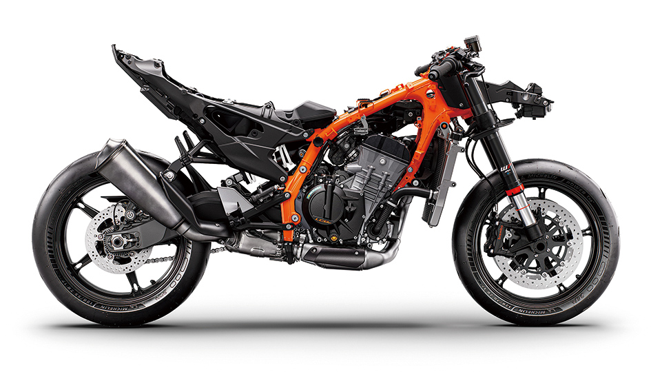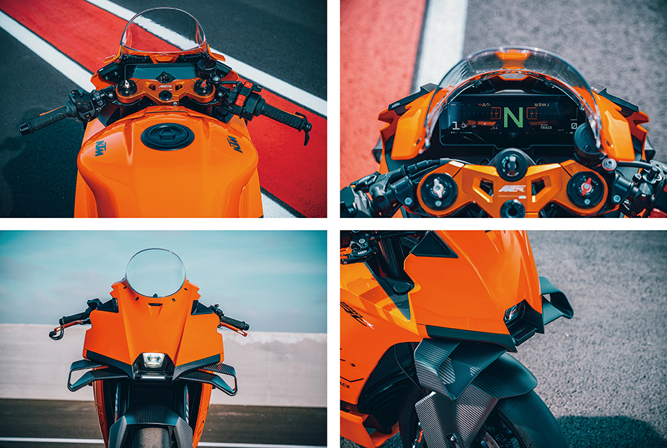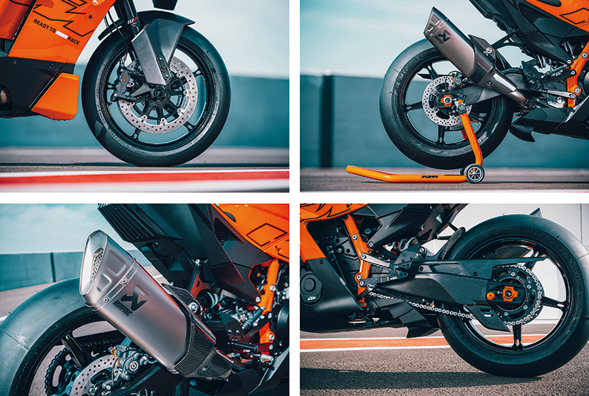 在懸掛與制動方面,KTM仍與WP緊密合作,前懸掛為WP Apex 48 mm倒立式前避震,具備開放式卡式結構及多段壓縮、回彈可調,後方則為全可調的Apex Pro避震器,並設有獨立高、低速壓縮調整功能。制動系統方面前方採用320mm雙浮動碟配Brembo Stylema卡鉗,後方則為240mm單鑽孔碟配單活塞卡鉗,煞車手感直接、力量分配自然。輪框為輕量化鑄鋁設計,搭配Pirelli Diablo Supercorsa SP輪胎,進一步突顯其賽道取向。乾重僅184kg,在同級中屬相當輕盈的設定,讓人更能感受到「人車一體」的靈活反應。