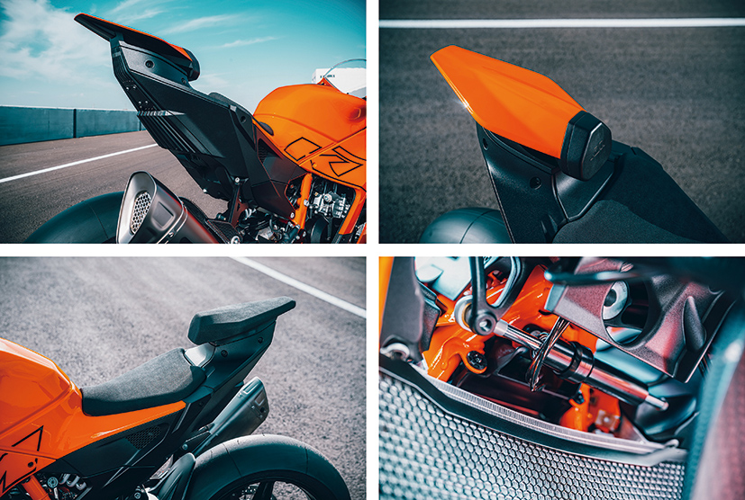 KTM亦特別為油缸與座艙設計了符合人體工學的「多接觸面」造型,讓騎仕在左右傾斜時更容易以腿部夾持車身。腳踏與手把均可調整,騎乘姿勢能依用途微調,無論街道還是賽道,都能找到理想重心位置。整體觀感上,RC R的外型比RC8更銳利、更緊湊,造工與線條銜接顯然經過風洞測試與實際比賽經驗修正。
