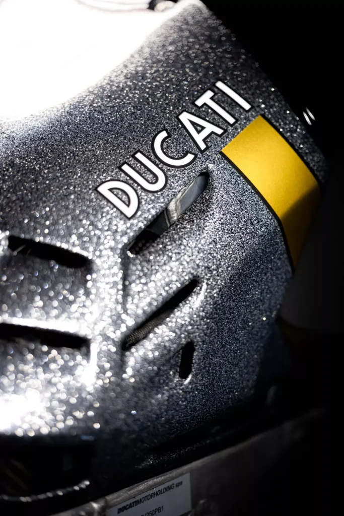 此塗裝靈感源自於1972年伊莫拉200英里賽事中締造傳奇冠亞軍包辦佳績的「750 Imola Desmo」。採用經典的銀色車身搭配藍色線條作點綴,為冠軍車款增添了歷史的厚重感。