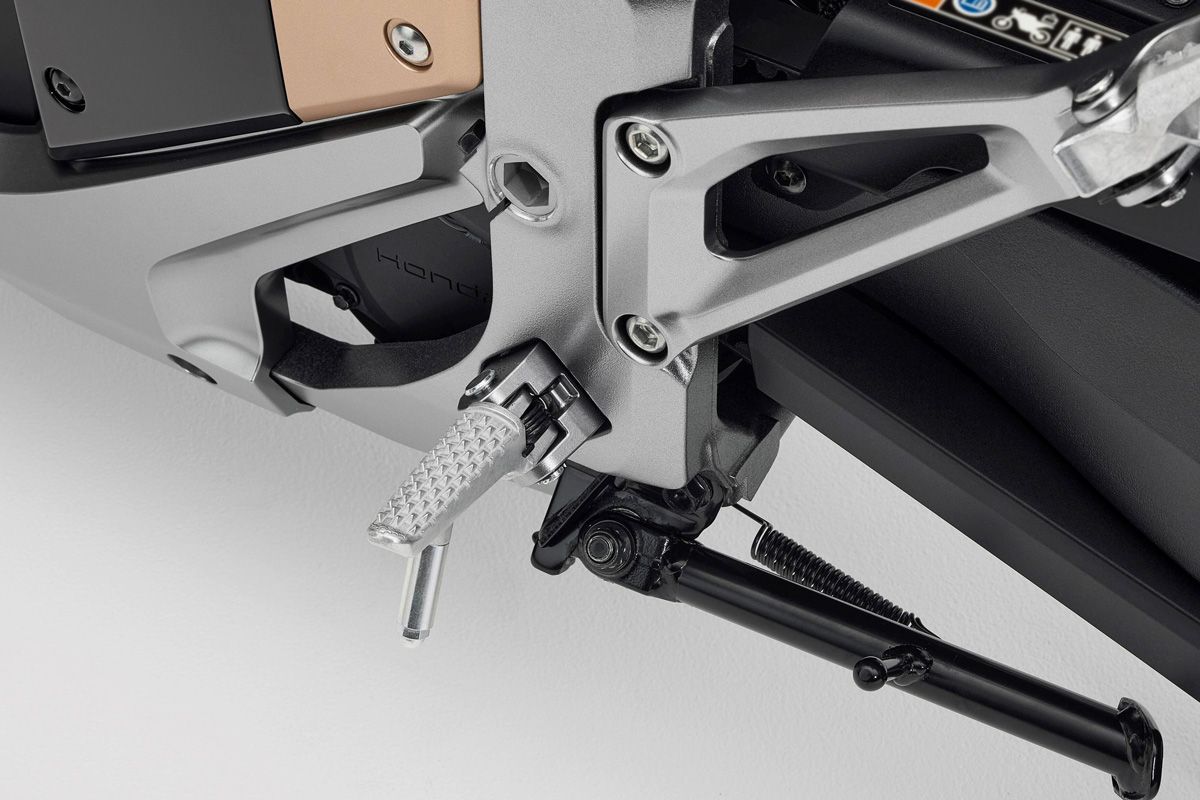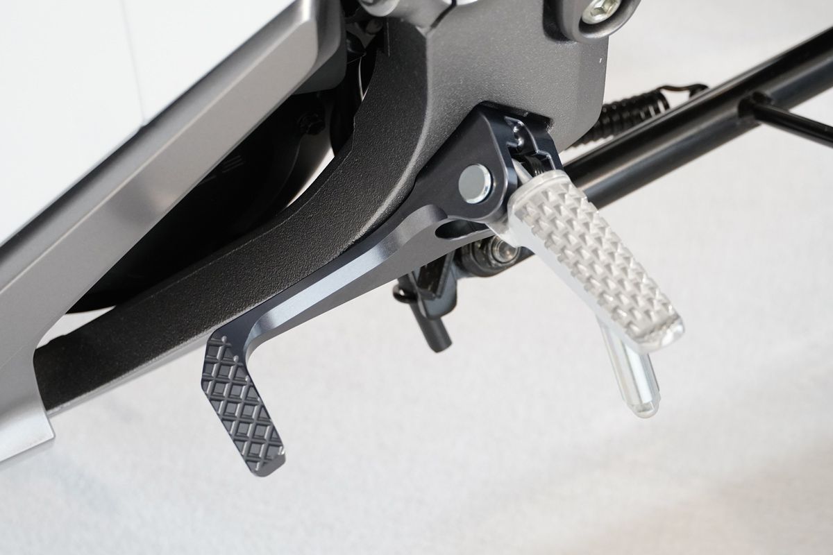 最值得注意的是左側腳踏配置了「偽換檔踏桿」。由於電動車無變速箱,原本不需設置踏桿,但因應員警需求,用於保持正確騎乘姿勢及足踝角度參考,研發團隊於是加裝了這根無法作動的「腳踏輔助桿」。
