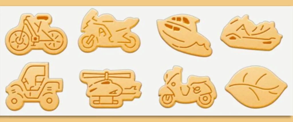「NORIMONO Sablé」蘊含了「希望大眾在享受美味的同時,也能認識 Yamaha Motor 產品」的初衷。餅乾設計包含:Yamaha 摩托車(電單車)、速克達(綿羊仔)、電動輔助自行車、動力艇、水上摩托車(水上電單車)、全地形車(ATV)、產業用無人直升機,再加上取自品牌名稱漢字「山葉」的葉子圖案,總共 8 種樣式。每一盒內含 8 種設計各一片。